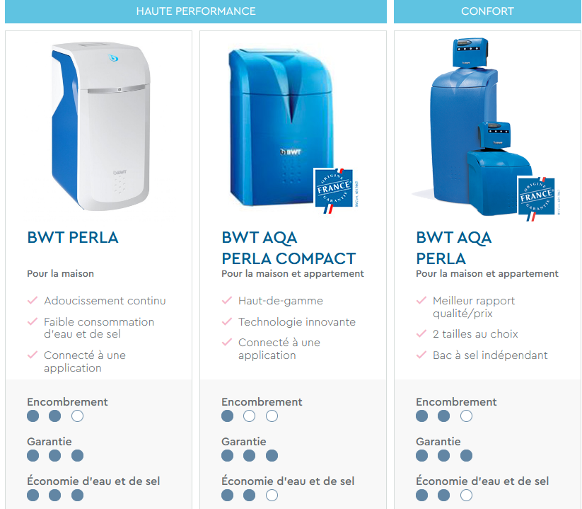 Une nouvelle gamme d’adoucisseur d’eau de haute technologie, le BWT AQA PERLA COMPACT. Innovant, ultra compact et performant, ce nouveau adoucisseur vous garantie une peau douce et soyeuse, les cheveux doux, un linge moelleux. Mais il va aussi vous faire faire des économies car il protège électroménager et les canalisations contre le calcaire.