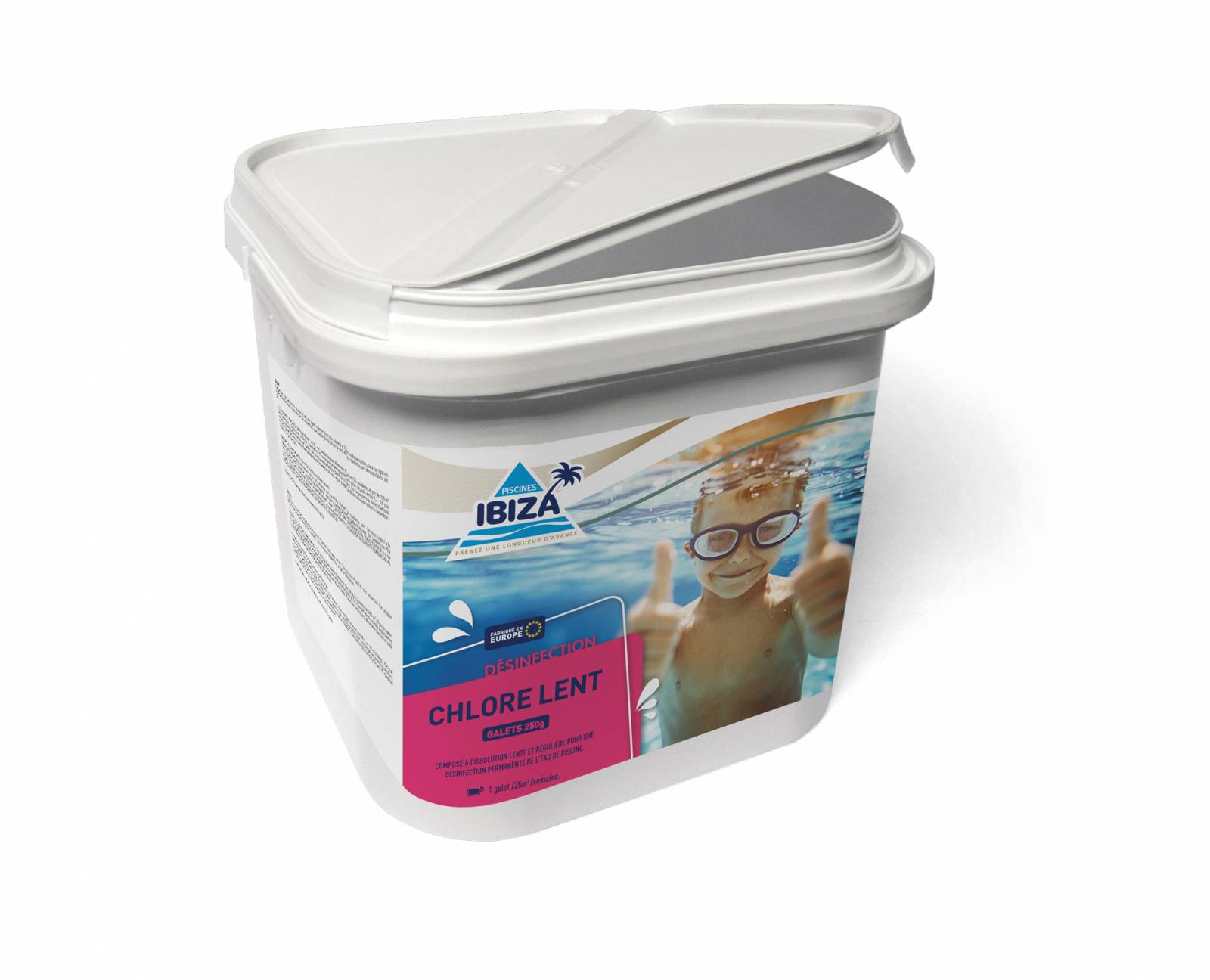 La gamme Ibiza propose à la vente un chlore lent, il agit sur la désinfection du bassin.