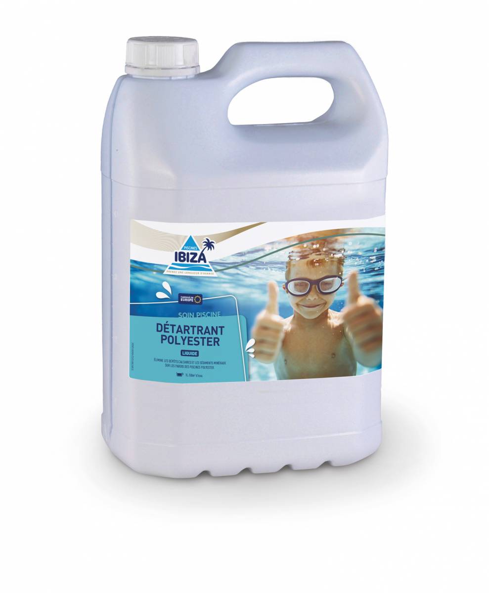 La gamme Ibiza propose à la vente un détergent liquide qui élimine les sédiments minéraux se formant sur les surfaces des piscines avec un revêtement en polyester.